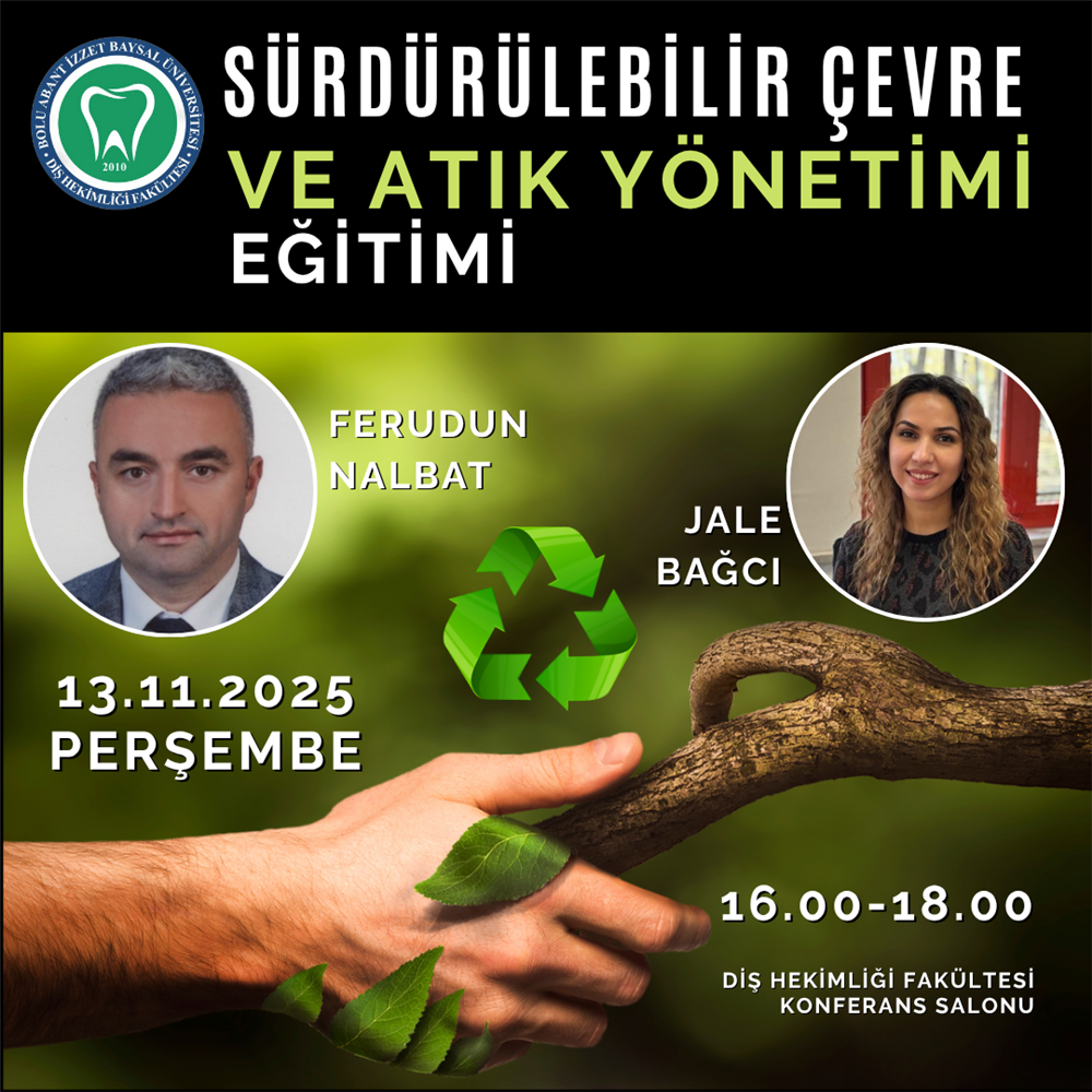 Fakültemizde yürütülen Sağlıkta Kalite Standartları çalışmaları kapsamında Tüm Personele verilecek '' Sürdürülebilir Çevre ve Atık Yönetimi'' konulu eğitim 13.11.2025 Perşembe günü 16:00 - 18:00 saatleri arasında Konferans Salonunda Çevre Mühendisi Jale BAĞCI ve Ferudun NALBAT tarafından gerçekleştirilecektir. Eğitime Tüm personelimiz katılacaktır.