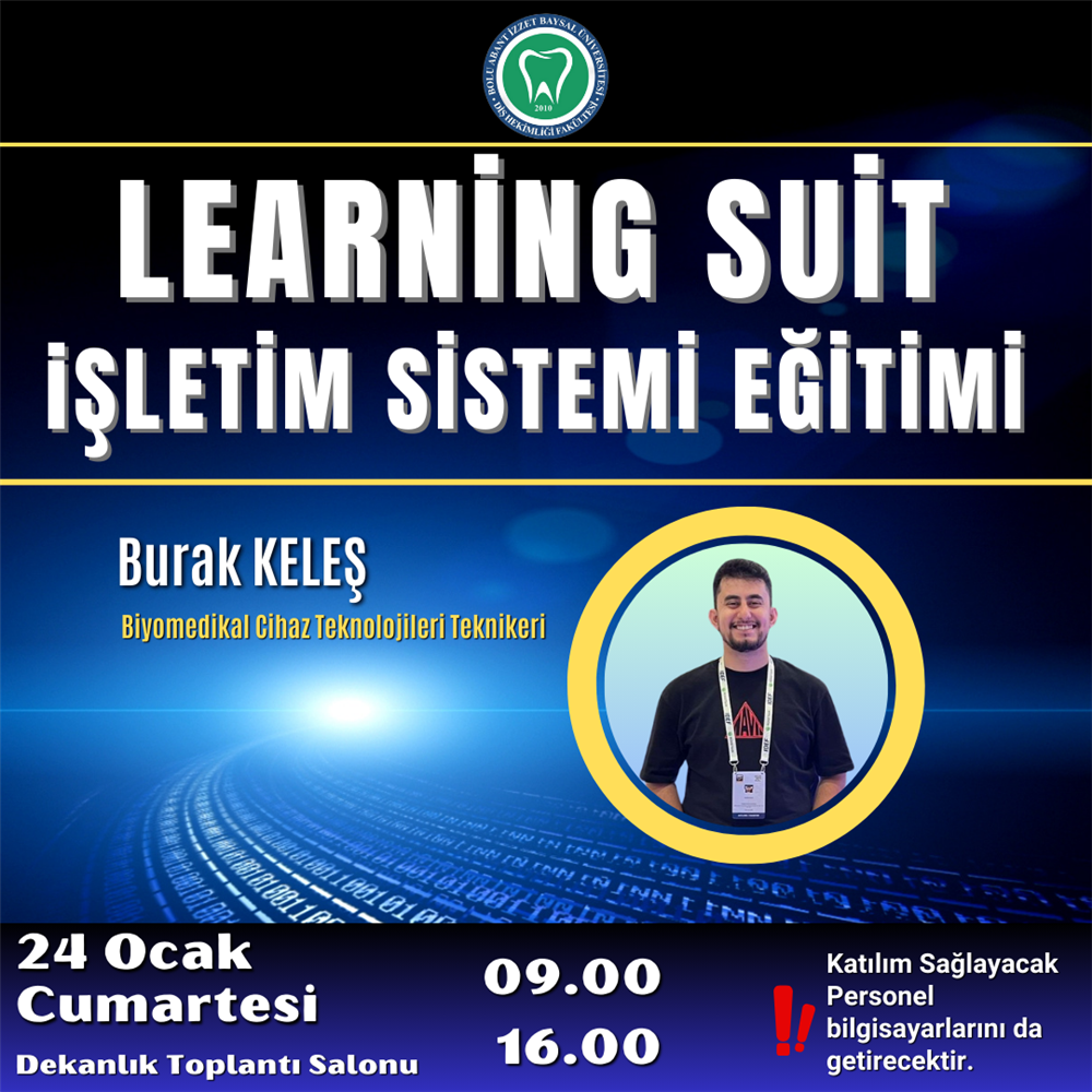 Fakültemizde 24 Ocak Cumartesi Günü Sayın Burak Keleş'in sunumuyla 'Learning Suit İşletim Sistemi' Eğitimi düzenlenecektir. Katılımcıların kendi bilgisayarlarını da yanlaruna almaları gerekmektedir.