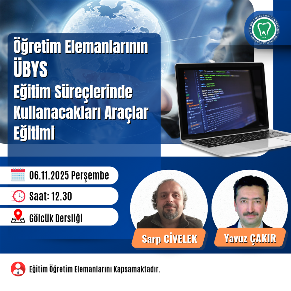 06.11.2025 Perşembe günü saat 12.30'da Gölcük Dersliğinde 'Öğretim Elemanlarının ÜBYS Eğitim Süreçlerinde Kullanacakları Araçlar Eğitimi' gerçekleştirilecektir. Eğitim Öğretim Üyelerimizi kapsamaktadır.