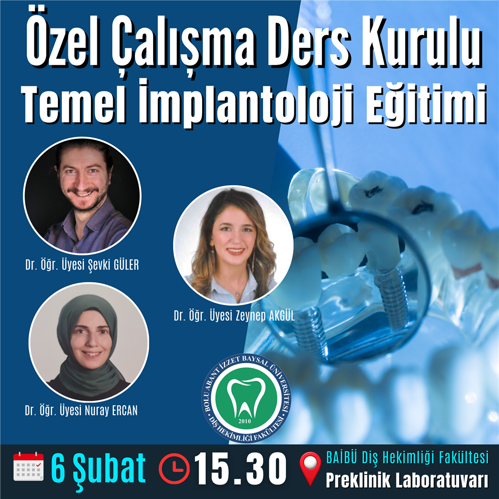 Fakültemizde 6 Şubat Cuma Günü saat 15.30'da 'Temel İmplantoloji Eğitimi' yapılacaktır. Eğitim Preklinik Laboratuvarımızda gerçekleşecektir. Teorik ve Pratik olarak gerçekleşecek eğitimi Dr. Öğr. Üyesi Şevki GÜLER, Dr. Öğr. Üyesi Zeynep AKGÜL ve Dr. Öğr. Üyesi Nuray ERCAN gerçekleştirecektir.