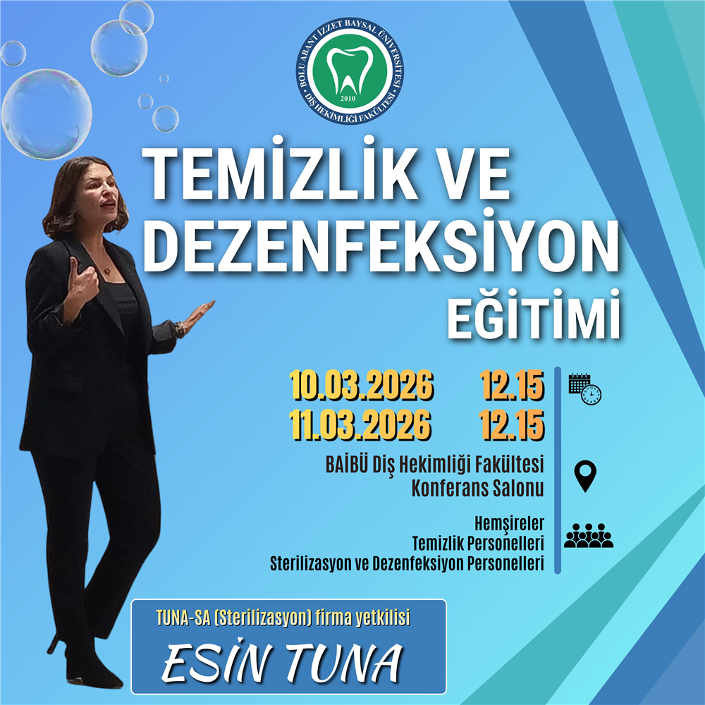 Fakültemizde yürütülen SKS çalışmaları kapsamında ilgili çalışanlara ''Dezenfektan etkinliğinin sağlanması için dikkat edilecek hususlar, gerekli kişisel koruyucu donanımın kullanımı, kaza durumunda yapılacaklar, dezenfeksiyon etkinliğini bozan durumların bildirimi, dezenfektanların saklanma koşulları, genel alanların temizlik kuralları, belirlenen risk düzeyine göre alanların temizlik kuralları, temizlik maddelerinin kullanım özellikleri, temizlik malzemelerine maruz kalma (göze sıçraması, ciltle teması gibi) durumlarında yapılacaklar ve ünit temizliği' konularında temizlik ve dezenfeksiyon eğitimi, 10.03.2026 tarihi saat 12.15'de ve 11.03.2026 tarihi saat 12.15'de Diş Hekimliği Fakültesi Konferans Salonunda TUNA-SA (Sterilizasyon) firma yetkilisi Esin TUNA tarafından verilecektir.