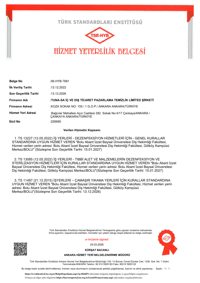 Bolu Abant İzzet Baysal Üniversitesi Diş Hekimliği Fakültesi olarak, sağlık hizmetlerinde kaliteyi bütüncül bir anlayışla ele almaya devam ediyoruz. Sterilizasyon ve dezenfeksiyon hizmetlerimizde sürdürdüğümüz yüksek standartların yanında, çamaşırhane hizmetlerimizin kalitesi de Türk Standardları Enstitüsü tarafından belgelendirildi.