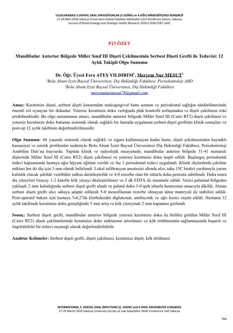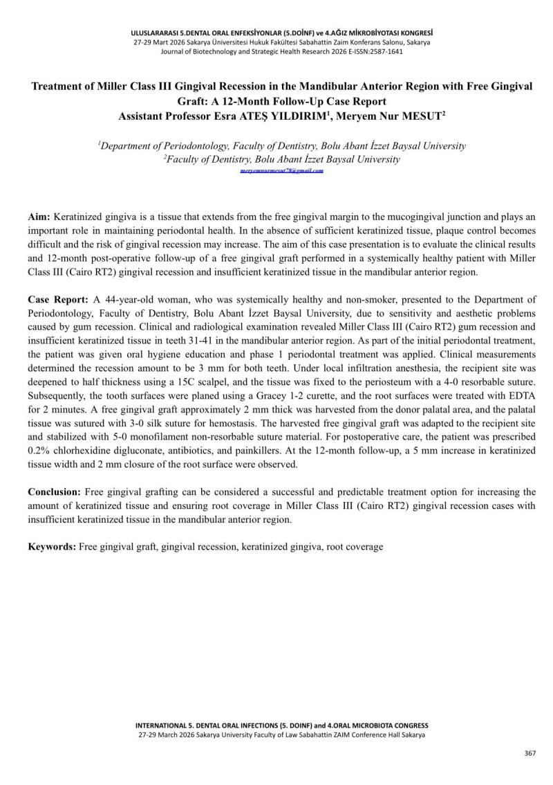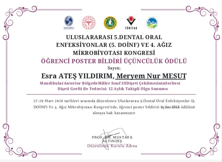 Fakültemiz Periodontoloji Anabilim dalı öğretim üyelerinden Doktor Öğretim Üyesi Esra Ateş Yıldırım ile 3. sınıf öğrencimiz Meryem Nur Mesut'un birlikte yaptıkları "Mandibüler antrior bölgede Miller sınıf 3 diş eti çekilmesinin serbest diş eti grefti ile tedavisi 12 aylık takipli olgu sunumu" isimli çalışma Sakarya Üniversitesi'nin düzenlediği 5.Dental Oral Enfeksiyonlar ve 4. Ağız Mikrobiyotası Kongresinde Öğrenci bildirisi alanında üçüncülük ödülü almıştır. Kendilerini kutlar, başarılarının devamını dileriz.