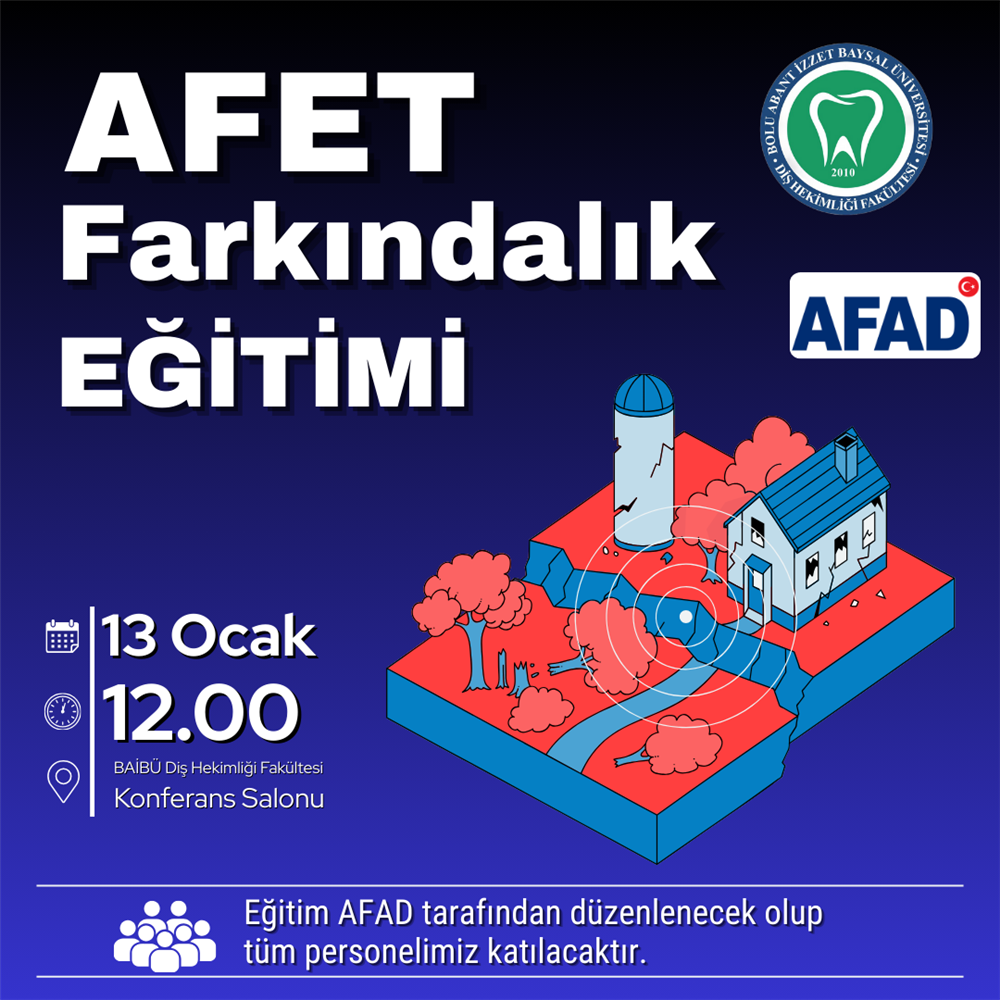 13 Ocak 2026 Salı Günü Fakültemiz Konferans Salonunda 'Afet Farkındalık Eğitimi' gerçekleşecektir. Eğitimi Afad bünyesinde görev yapan personel gerçekleştirecektir. İlgili eğitime tüm personelimizin katılması gerekmektedir.