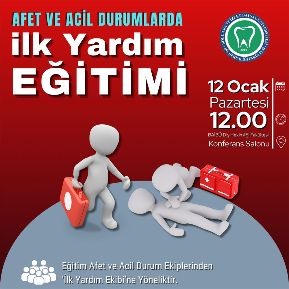 12.01.2026 tarihi saat 12.00 de Afet ve Acil Durum Ekiplerimizden İlk Yardım Ekibimizin katılacağı 'Afet ve Acil Durumlarda İlk Yardım Eğitimi' gerçekleşecektir. Eğitim Fakültemiz Konferans salonunda verilecektir.