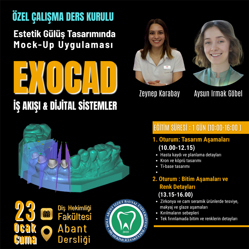 23 Ocak 2026 Cuma Günü Fakültemiz Abant Dersliğinde 'Exocad İş Akışı ve Dijital Sistemler' eğitimi gerçekleşecektir. Eğitimin süresi bir günü kapsamaktadır. Eğitimi Çatak Diş Deposu bünyesinde Dijital Sistemler Eğitmeni olarak görev yapan Zeynep Karabay ve Aysun Irmak Göbel gerçekleştirecektir. İlgili eğitimin ayrıntıları pdf dosyasında yer almaktadır.